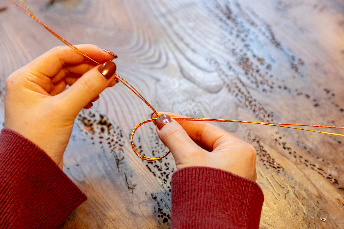 結び方がわかってくると、どんどん楽しく進められます。水引は10種類以上の結び方があるそうですが、ここでは水引の基本である「あわじ結び」をアレンジした「梅結び」という結び方で作ります。初心者でも簡単に作れるのが嬉しいポイント。