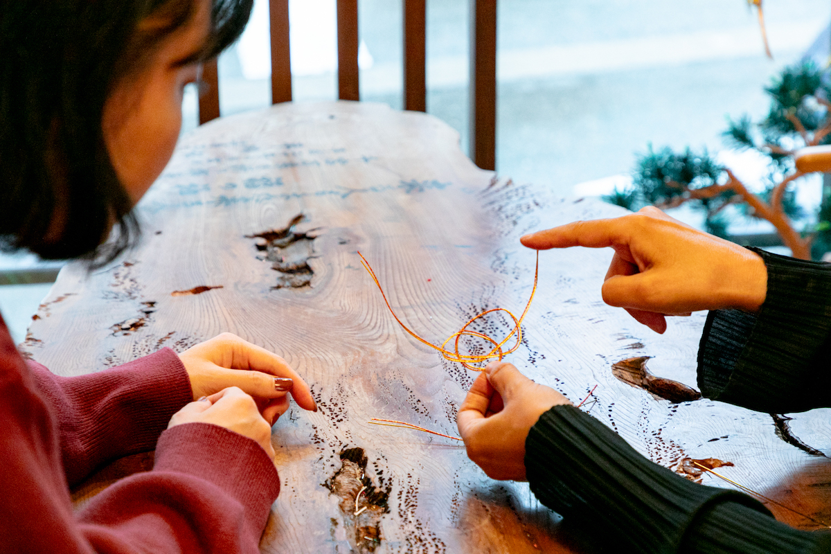 色を選んだら、選んだ水引ではなく練習用の水引で先生に簡単な結び方を教えてもらいます。レクチャーが終わったら早速選んだ水引で結んでいきます。