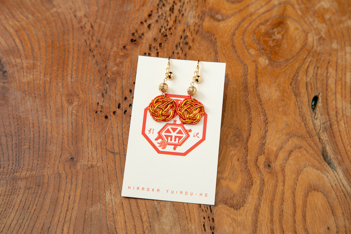 レクチャー通り結び終わったら、先生に形を少し整えてもらい、イヤリングのパーツをつけて完成!選んだ赤と金の水引の色がきれいに合わさって素敵なデザインになりました。