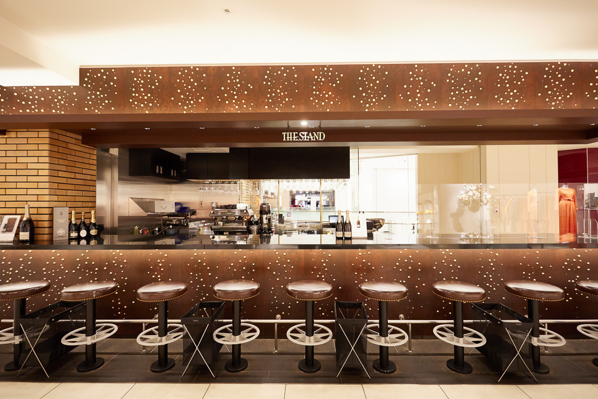 「シャンパーニュバー ザ・スタンド」は、伊勢丹新宿店2階にあるシャンパンバー。専用の入口はなく、カウンターがテナントの並ぶ通路に面していてオープンな店構えです。ひとりでシャンパンを飲むなんて、少し勇気がいる…という人でも、立ち寄りやすい雰囲気。開放感がありつつも、周りのテナントはファッションの最先端をいくブランドばかりで、洗練された雰囲気の中でシャンパンを楽しむことができます。