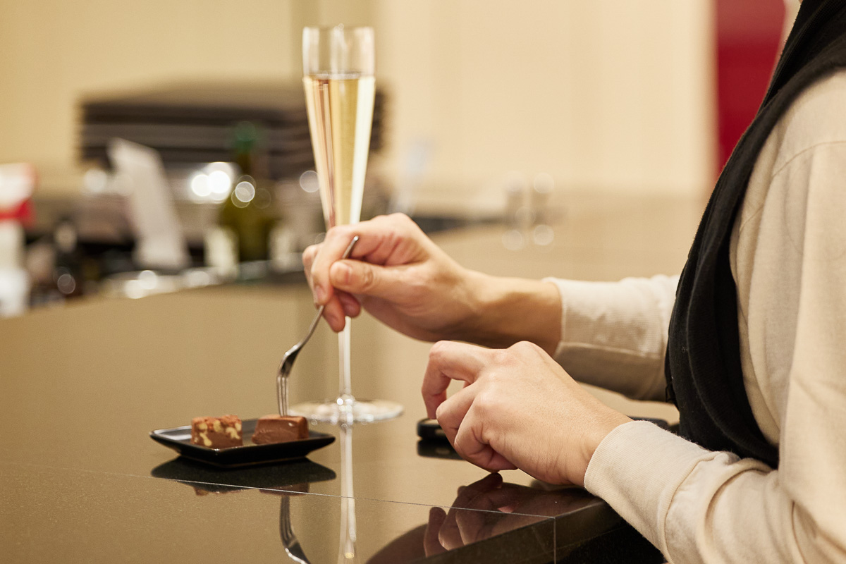 日中にシャンパングラスを傾けつつチョコレートをいただく、リッチな時間。パクッとひと口で食べてしまいたいところをグッとおさえて、ゆっくり味わいながら少しずついただきます。