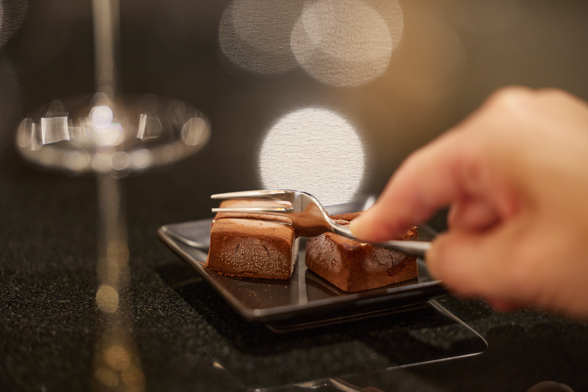 チョコレートは、すっとフォークが入る軟らかさ。チョコレートの香りと、シャンパンの香りが混ざり合い、幸せな気分に。
