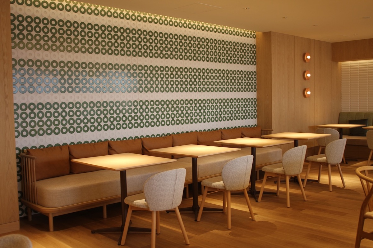 座席はテーブル席が中心。壁面は「京ばあむ」デザインで、ここにも「京ばあむ」が散りばめられています。