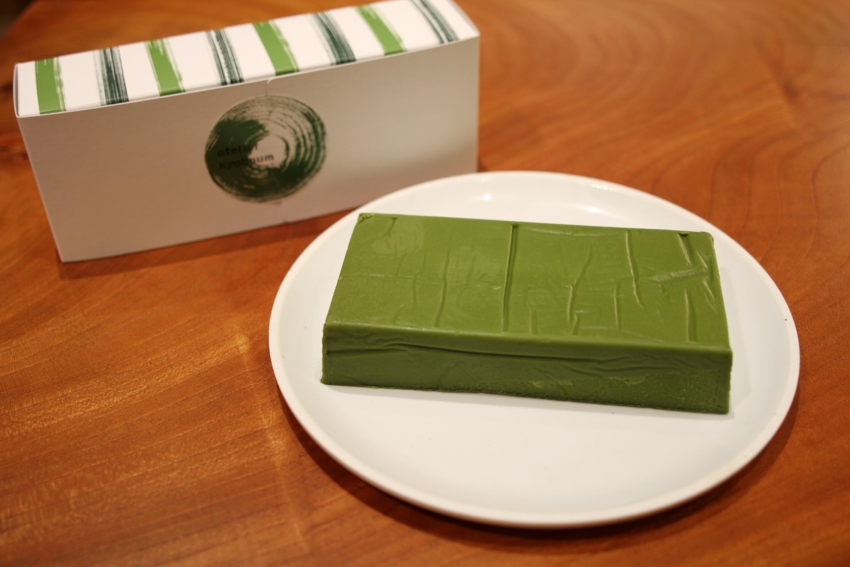 「盆地すふれ」1188円は、京都産の宇治抹茶、北海道産の小麦粉に十勝産の小豆、日本名水百選「瓜割の水」を使用したスフレ。京都の地形から着想を得たことから「盆地すふれ」と名付けられたスイーツで、表面には碁盤と「京」の文字が刻印されています。