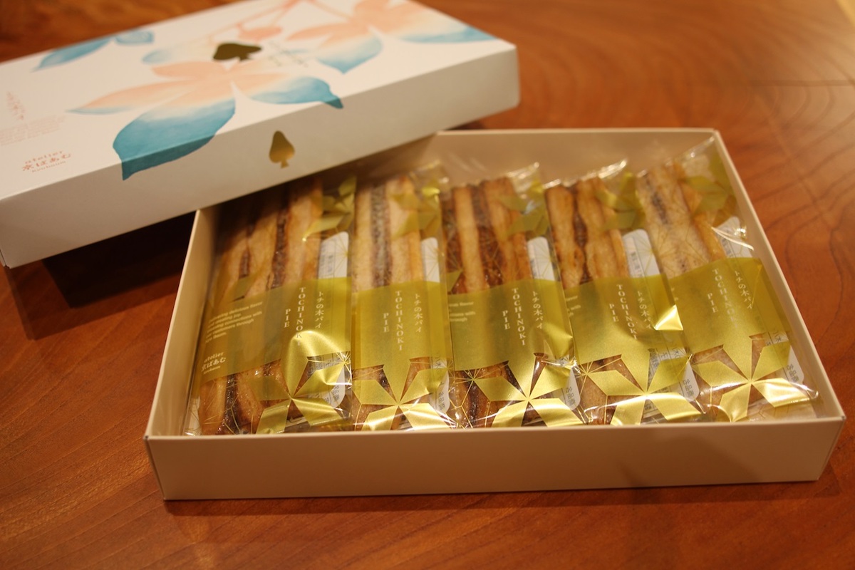 「トチの木パイ」1枚378円、5枚入1890円は、「atelier京ばあむ」のシンボルである「トチの木」をイメージして作られたパイ。サクッと食感に、香ばしいバターの香りが広がり、お茶請けにもぴったりです。