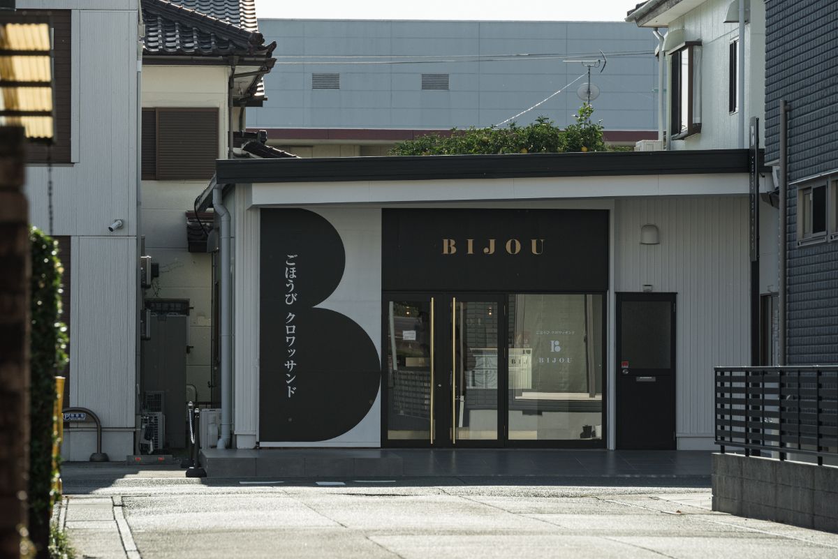 東名高速道路浜松西ICから車で約3分の場所に位置する「BIJOU」は、クロワッサンを使用したサンドイッチ「クロワッサンド」の専門店。住宅街の中に現れる、黒と白が基調の外観が目印です。