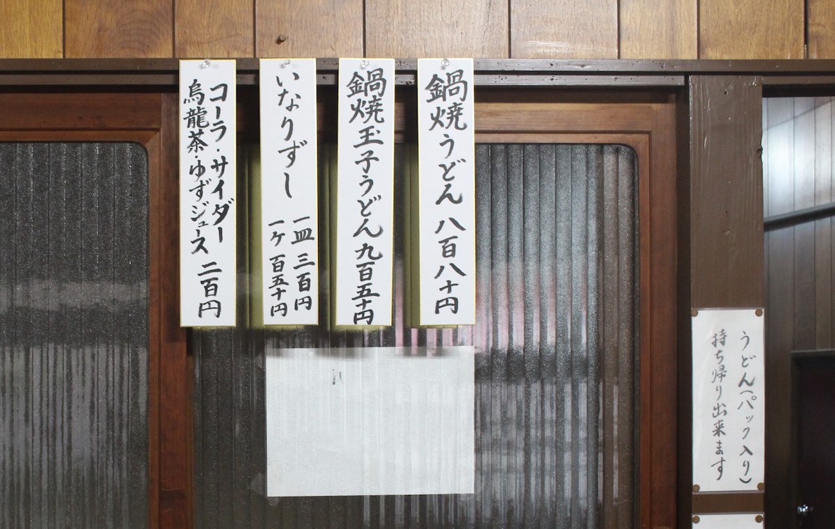 食事メニューは「鍋焼きうどん」と「いなりずし」オンリー。「いなりずし」は1皿300円で鍋焼きうどんとの相性も抜群です。