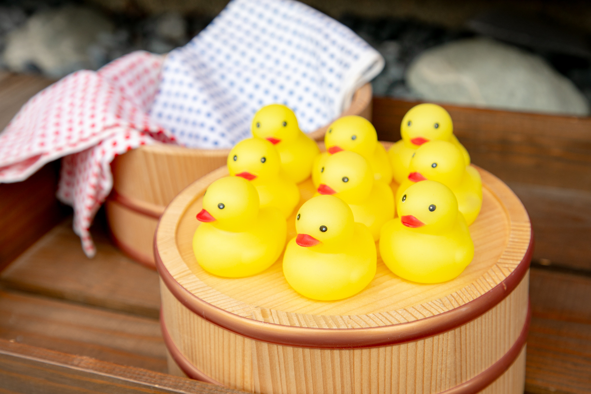 見てください!湯桶やアヒルちゃん、タオルなど、温泉感があふれています。こちらは自由に使っていいので一緒に写真を撮ってみてくださいね。※撮影等で利用はできますが、持ち帰りはNG。