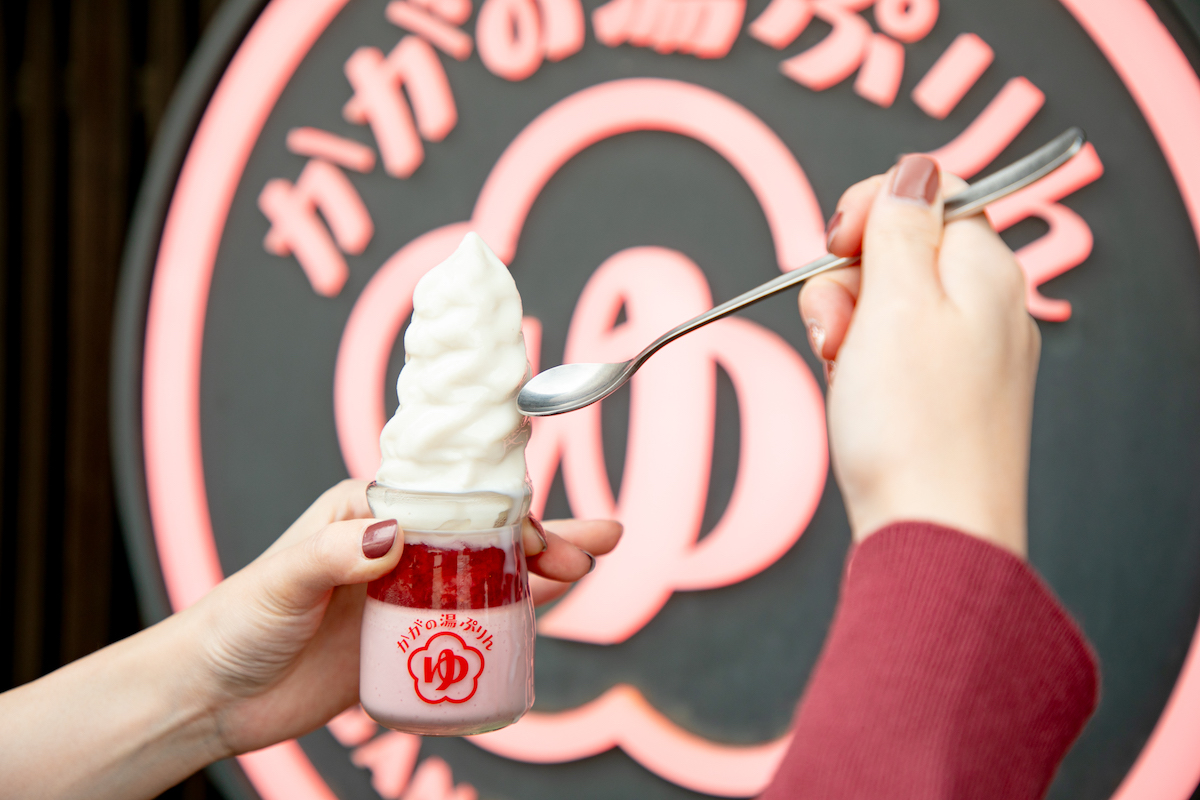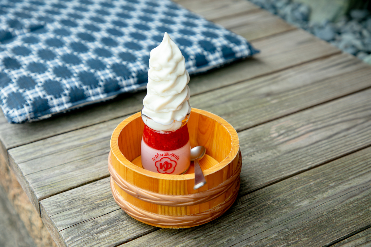 こちらはインパクトがある見た目ですよね。店舗限定の「湯けむりソフトぷりん」680円で、温泉の湯気のような白いソフトクリームを、選んだプリンの上にのせています。今回選んだのは「いちごぷりん」。