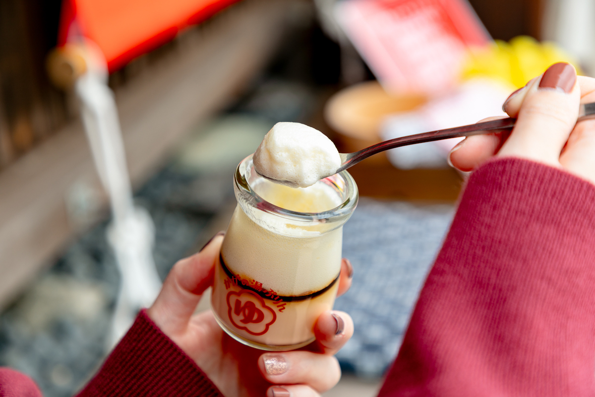 店舗限定の「湯けむりソフトぷりん」もいただきます。こちらはインパクトがあってフォトジェニックなので写真を撮らずにはいられない!しかし風が強い日や気温によってはすぐ溶けてしまうので、写真を撮りたい場合は受け取ったらすぐに撮影するのがベスト。