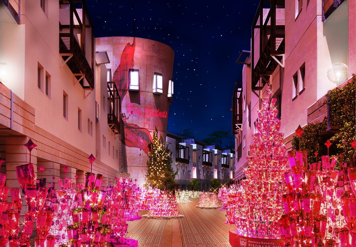 「星野リゾート リゾナーレ八ヶ岳」では2019年からワインボトルを使ったクリスマスツリーを設置し、「ワインリゾートクリスマス」を開催しています。5回目を迎える今年はワインリゾートらしい⾊味でクリスマスイベントを盛り上げようと、テーマを「⾚ワイン」に決定。
