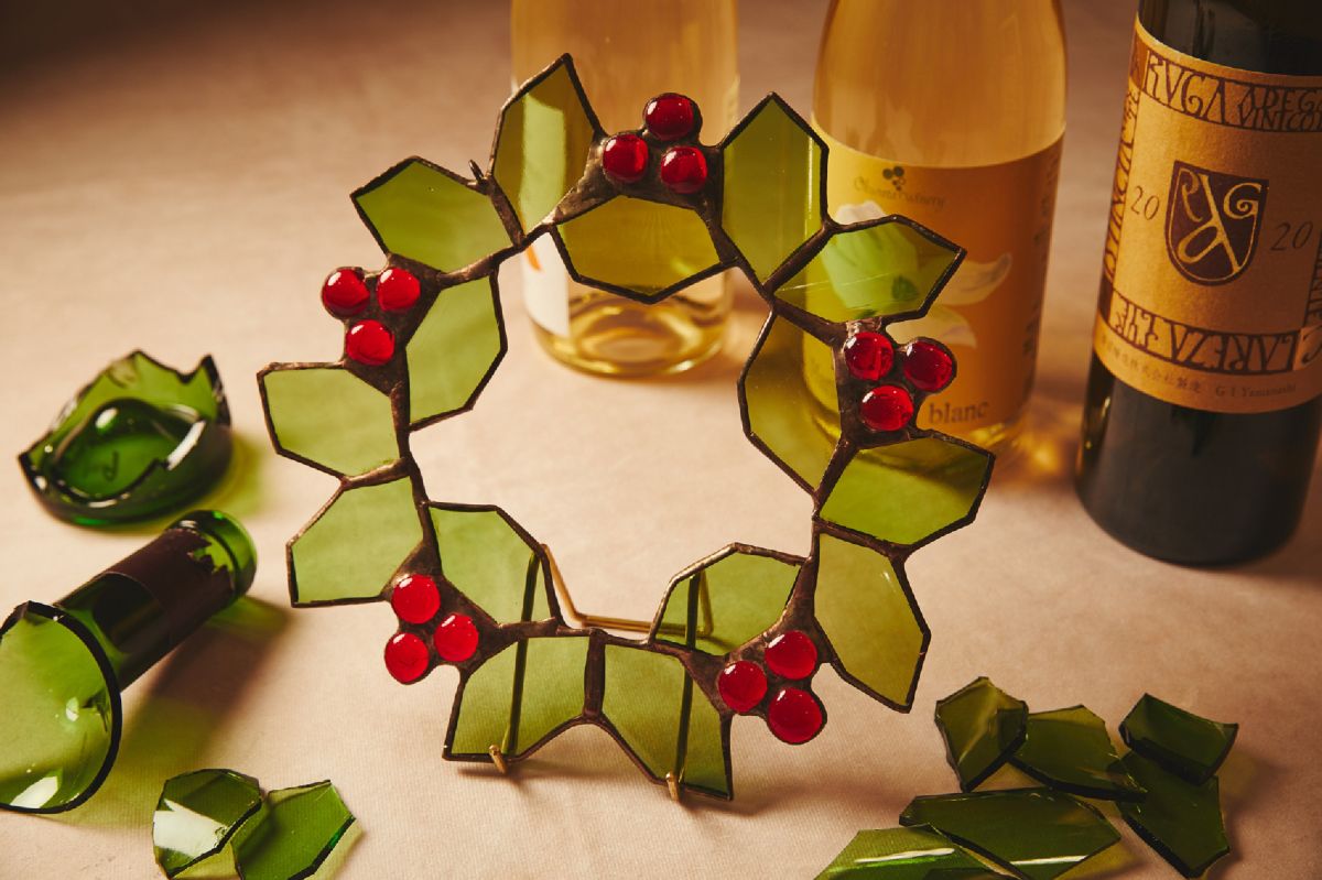 パーツとして使うのは、ピーマン通りに並ぶワインボトルツリーの装飾に使⽤する中で、ひびが⼊り使えなくなったワインボトル。ワインボトルのかけらを組み合わせながら、思い思いにクリスマスリースを形作っていきます。作品は帰宅後に自宅まで届けられるので、家に帰ってからもワインリゾートでのクリスマスの思い出を楽しめます。