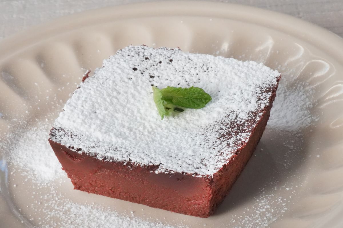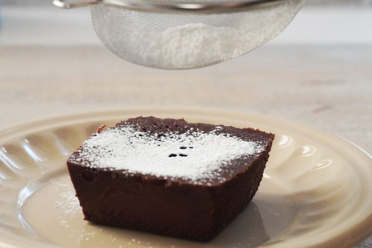 定番で最もシンプルなのが、粉糖を茶こしなどでふるってパラパラとかけるというもの。チョコレートの茶色が、雪化粧をしたみたいになります。ミントなど飾れば、もう完璧なカフェのデザートですね。