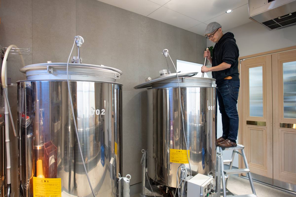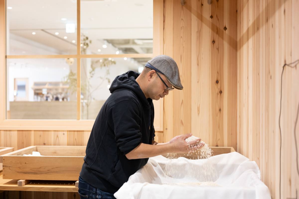 長浜市内で育てられた無農薬無肥料栽培米と池島さんが丹精込めて仕込んだ米糀、地下水を原料としたハッピー太郎醸造所のどぶろく。造りの工程で出る「もろみ」を漉(こ)していないため、日本酒とは異なり白濁した見た目にとろりとした口当たり。後味がスッキリしているのも特徴です。通常、酒蔵では米糀造りの作業を見学することはできませんが、湖のスコーレでは池島さんが米糀造りを行う様子をガラス越しに見学できます。
