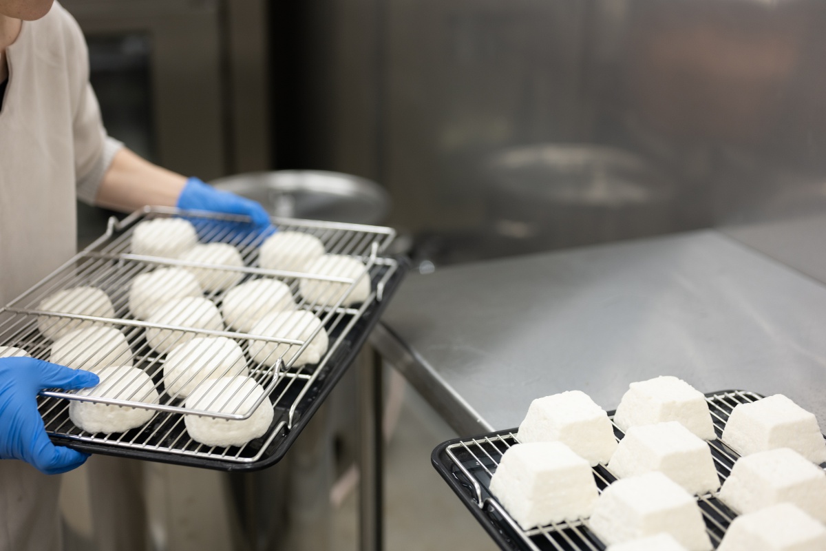 続いて特別に許可をいただき訪れたのが、チーズ製造室です。滋賀県竜王町にある古株牧場の搾りたての生乳を使って作るスコーレオリジナルのチーズは、チーズ職人・中野つや子さん監修のもと、滋賀の発酵文化や風土を取り入れた約10種類ほどをラインアップ。