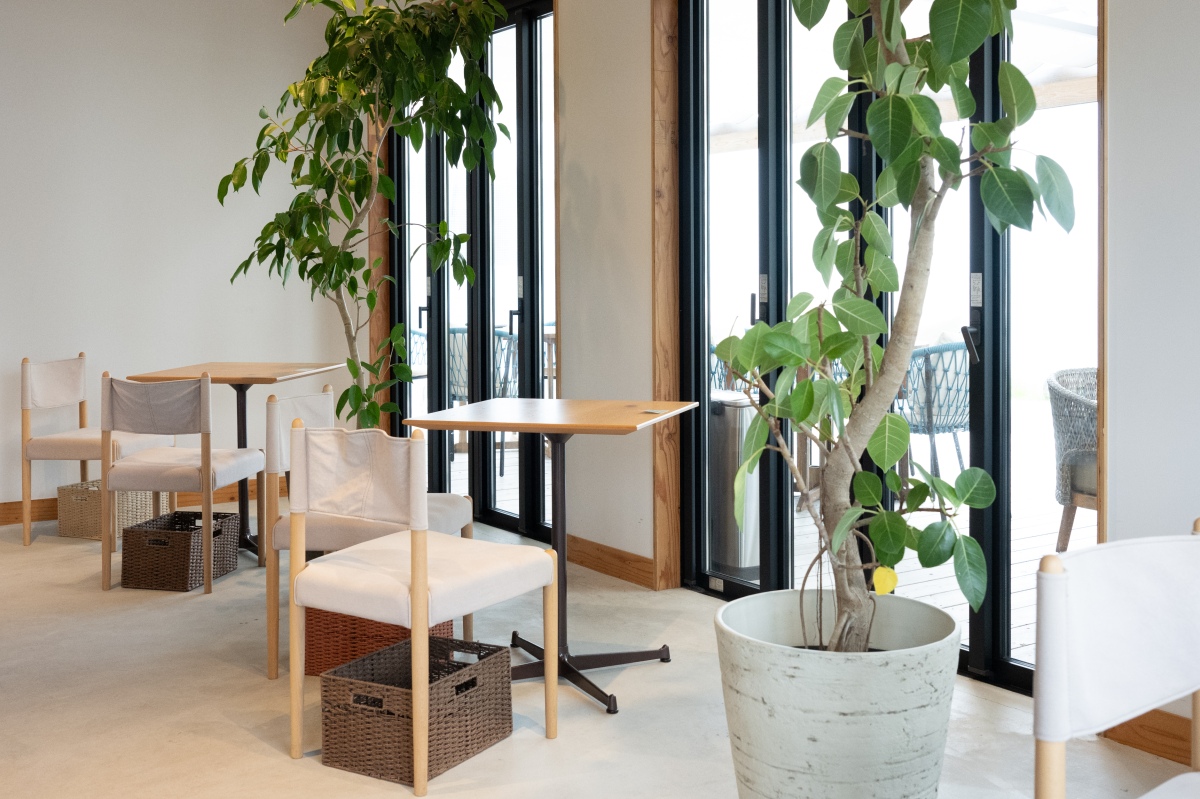 日光がたっぷり入る店内は、木を基調とした温かみのあるインテリアで統一。天気の良い日にはテラスに面した大きな窓が開け放たれ、店内にいながらびわ湖の絶景が楽しめます。