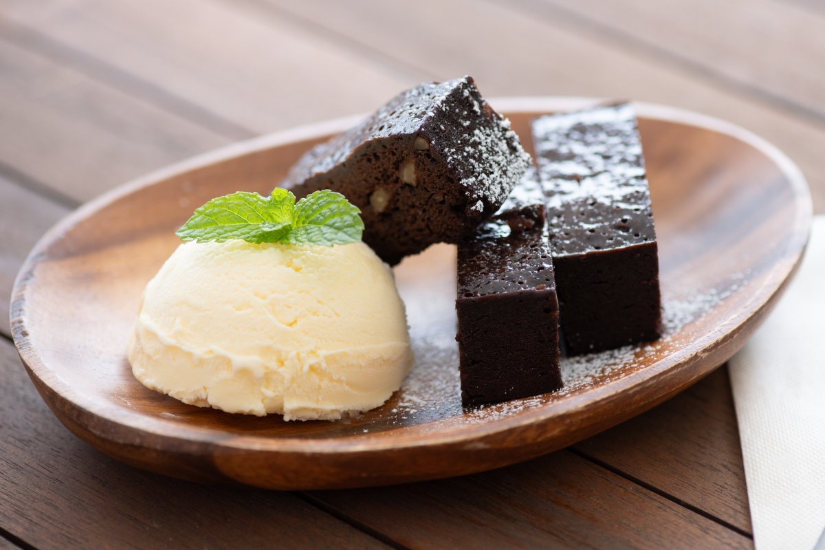 濃厚な「チョコレートブラウニー」650円など、デザートメニューも充実。ザクザクのナッツが香ばしいしっとり食感のブラウニーは、バニラアイスと相性抜群です。