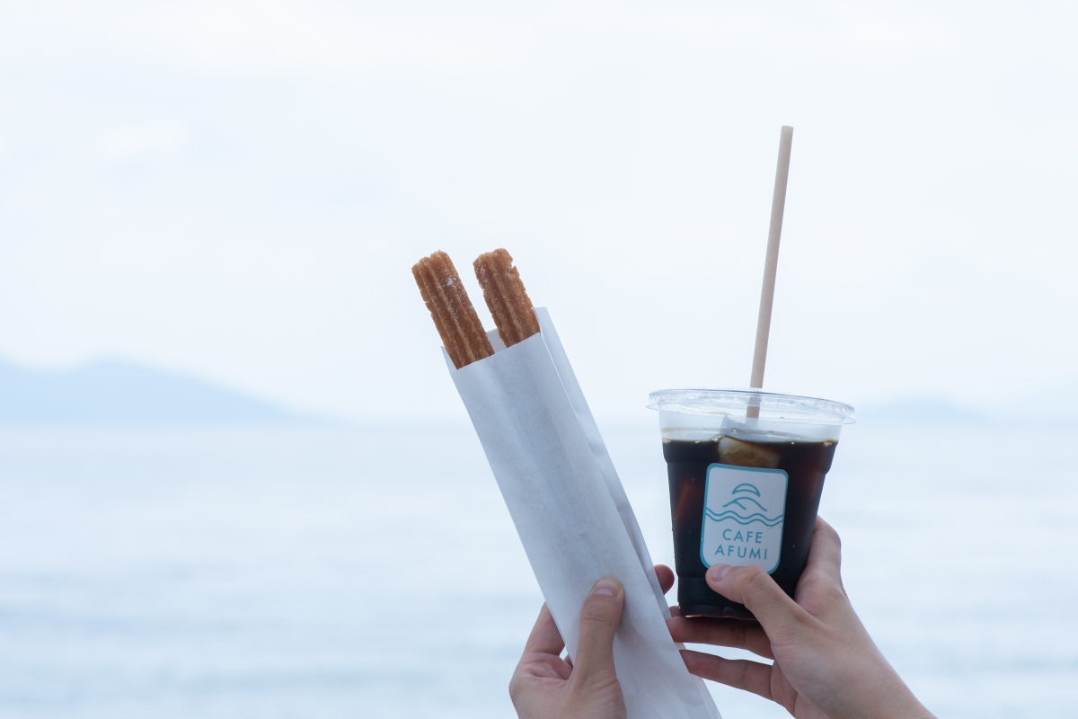 ドリンクや一部のスイーツはテイクアウトも可能。カフェの前の砂浜は「AFUMI KITAKOMATSU」の専用ビーチとなっているので、「ベイクドハニーチュロス」600円(2本)などを片手にゆっくりお散歩するのはいかが?