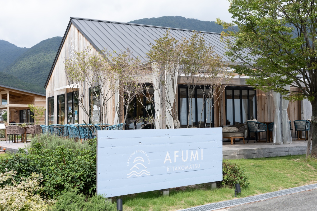 びわ湖畔にオープンした「Cafe AFUMI」は、自然と調和したログハウス風の外観が印象的。グランピング施設「AFUMI KITAKOMATSU」に併設するカフェですが、宿泊者以外も利用することができます。