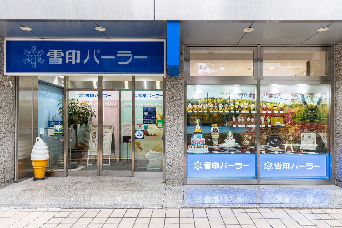 「雪印パーラー札幌本店」が構えるのは、JR札幌駅と地下鉄大通駅のほぼ中間。西3丁目通に掲げられたブルーの看板とソフトクリームのオブジェが目印です。ショーケースには、パフェのメニューサンプルがにぎやかに並び、入店前から期待感が高まります。