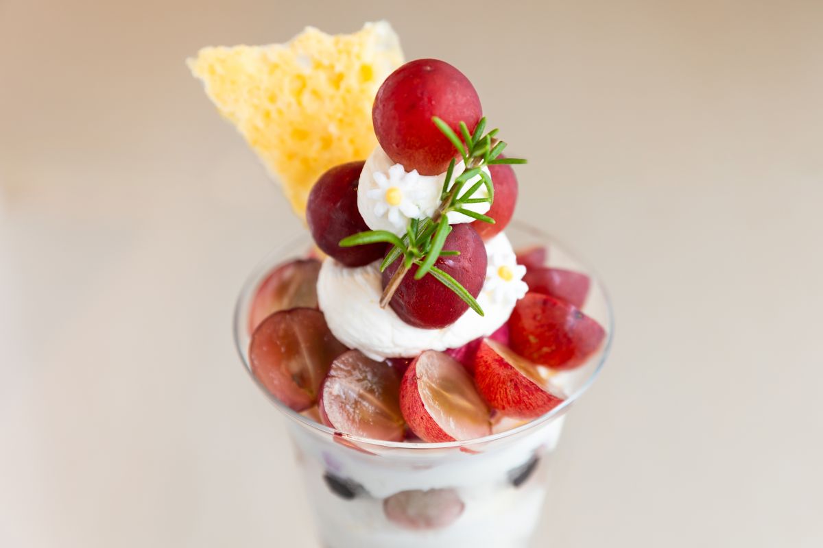 春はイチゴ、夏はメロンなど、旬の食材を使った季節ごとの限定パフェが登場するのも、この店の魅力。こちらはブドウをたっぷりトッピングした秋限定のパフェです。