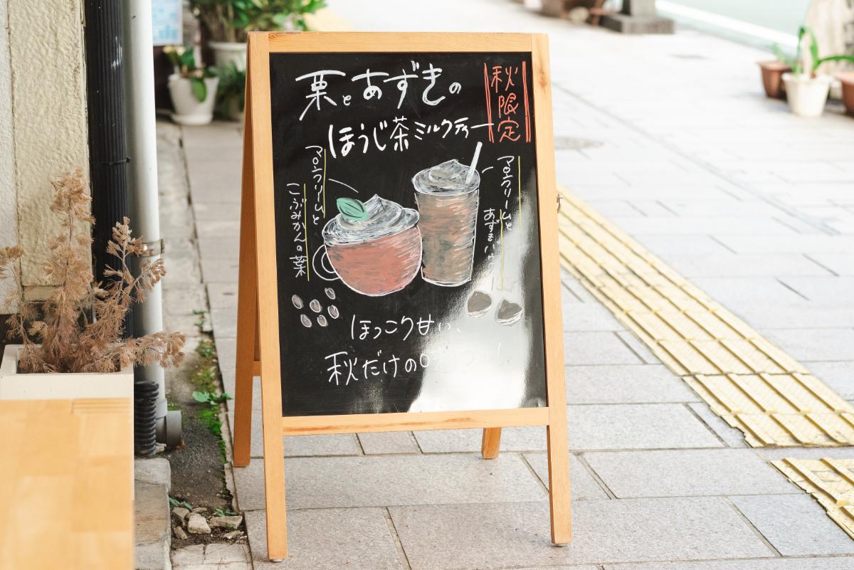 季節によって異なる限定メニューのポップは、店長の辻さんによる手書き。かわいい看板に引き寄せられるかのように、店内へとお邪魔します。