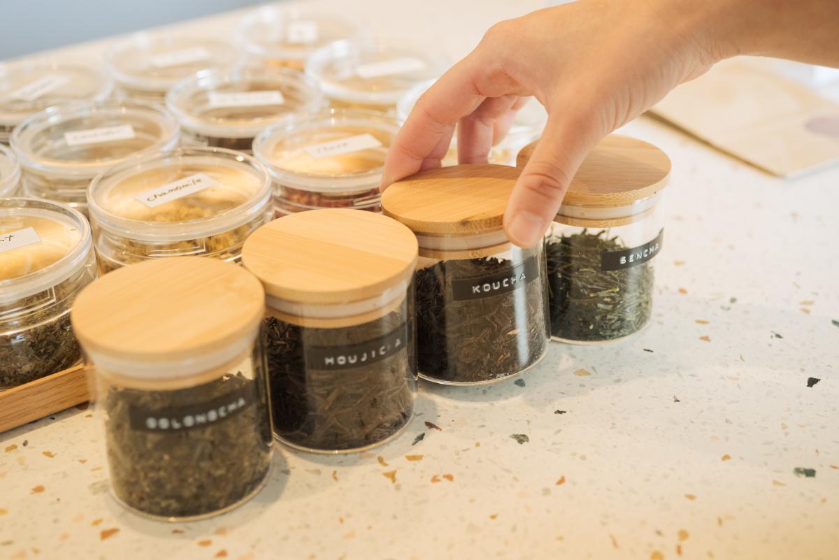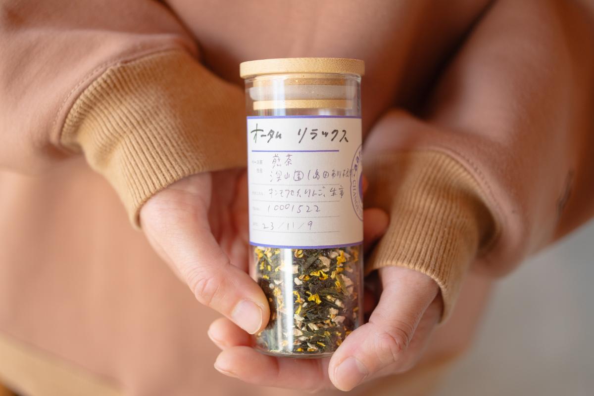 手前の瓶は、豊かな香りが楽しめるテスター。香りからお茶の味を想像したり、飲んでいるシーンを思い浮かべたり。煎茶×バナナ、和紅茶×赤紫蘇など、思いもよらぬ素材の組み合わせに胸が高鳴ります。