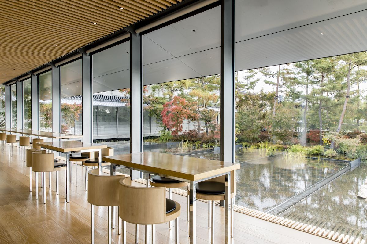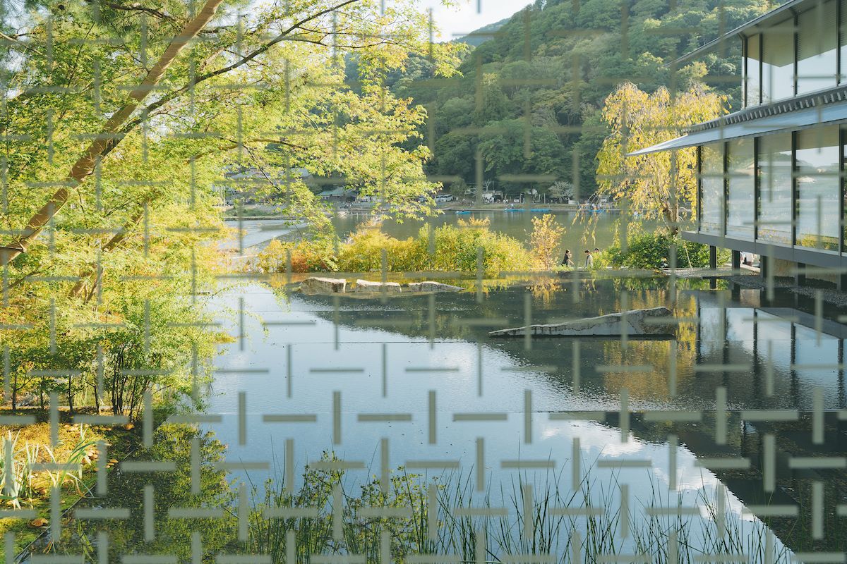 外壁のガラスには、伝統的な網代(あじろ)模様がプリントされており、嵐山を透かし見ることも。
