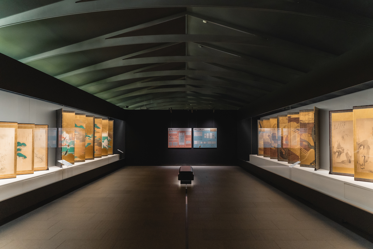 日本画を守るための「蔵」をイメージしたという展示室内。展示ケースの一部は、作品に合わせて壁を動かすことができ、最短で30cmの至近距離で質感や色をまじまじと観察できるように工夫しているんだとか。