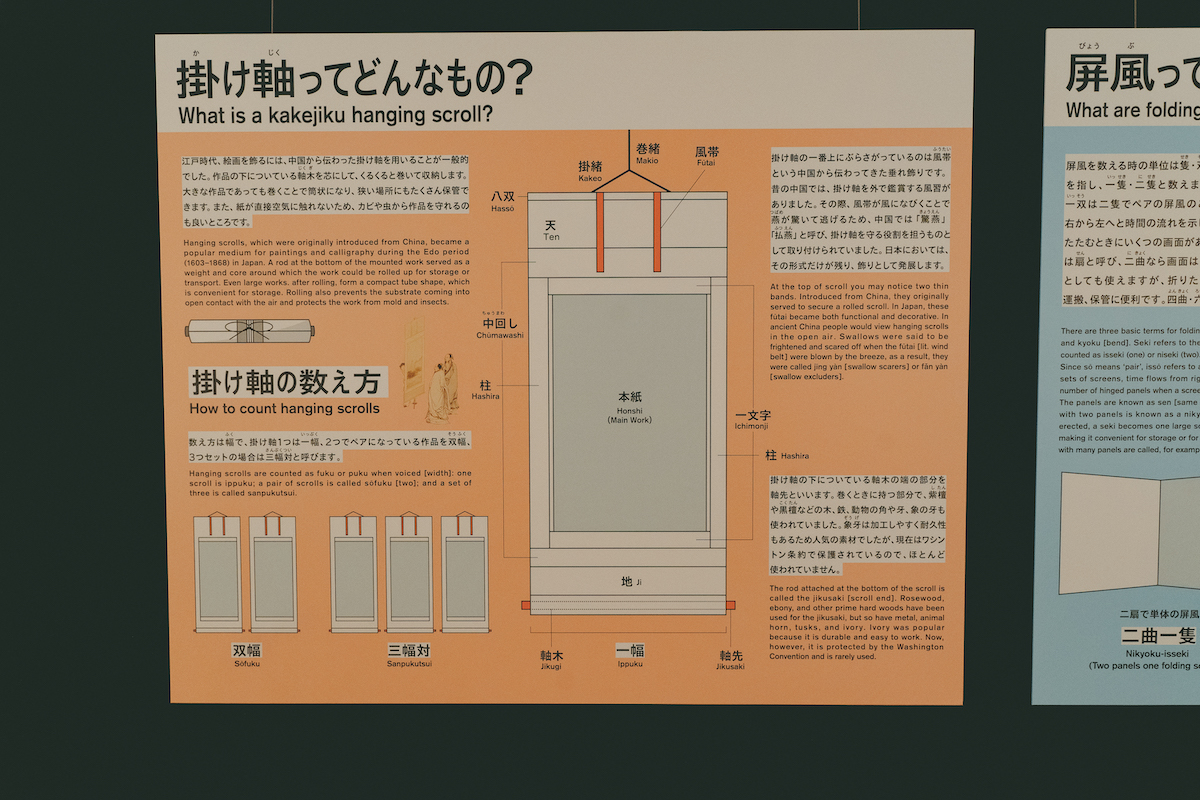 そんな日本絵画初心者さんにぜひ見てほしいのが、各絵画の近くに設置されている、今更聞けない基本の「き」から教えてくれるこのパネル。「掛け軸ってどんなもの?」「屏風って右から見るの?左から見るの?」といった基礎知識から、「葛飾北斎は長生きだったって本当?」といった豆知識まで、楽しく学びながら絵画鑑賞ができるんです。