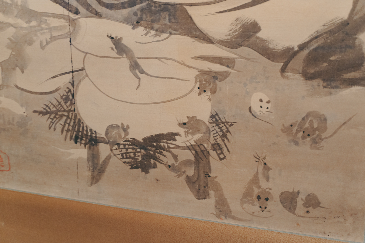 近づいてよく見てみると、足元には繊細なタッチで描かれたネズミたちが。今にも飛び出して生き生きと動き回りそう!