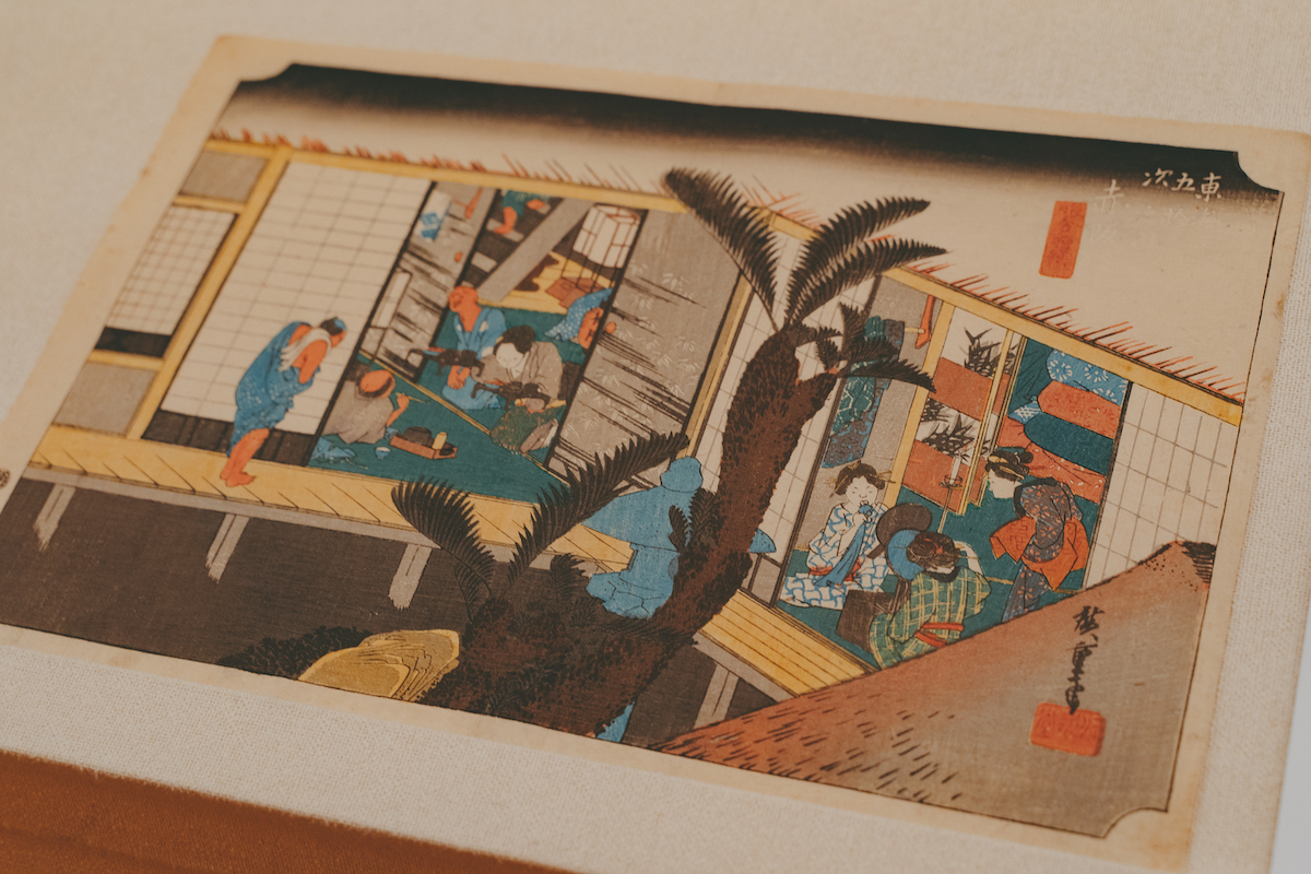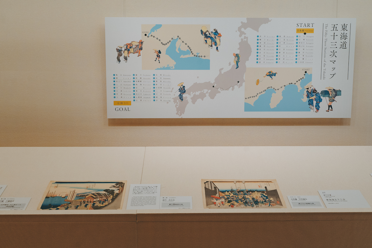 第二会場の嵯峨嵐山文華館では、誰もが一度は教科書で目にしたことがある歌川広重の傑作『東海道五十三次』を展示。「次」とは、宿駅のある場所をさす言葉で、徳川家康時代、江戸と京の間に53の宿駅が設置されており、その道中を描いたことから、その名がついたのだそう。今回、スタート地点の日本橋とゴールの京都・三条大橋を含んだ55枚からなる作品すべてを、前期・後期の2段階に渡って展示しています。