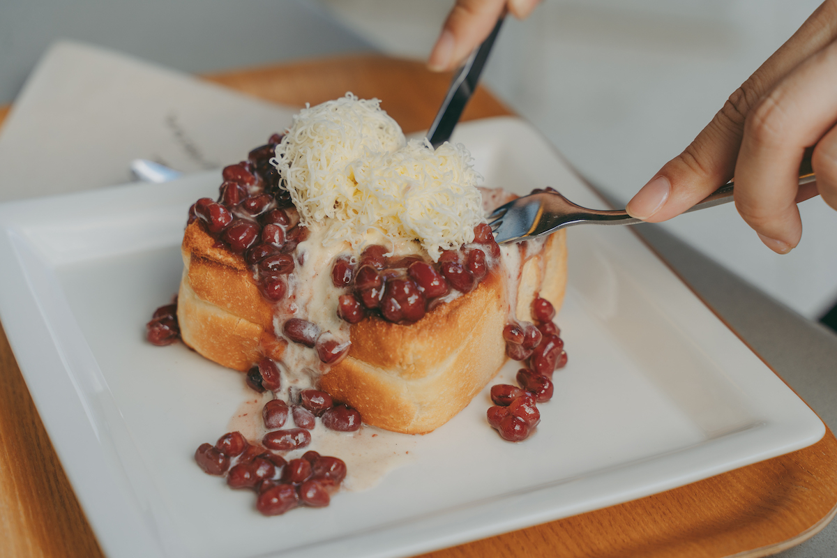 おすすめは、コスパ抜群の厚切り小倉あんバタートースト。国産もち米を使った、お餅のような食感が楽しめる新感覚のパンは、もちもち食感がたまりません。あふれんばかりの大粒の小倉あんは、小豆の食感が程よく残っており、糸状に絞られた有塩バター、豪快にのったバニラアイスとの相性抜群。旅で疲れた身体に優しい甘さが染み渡ります。