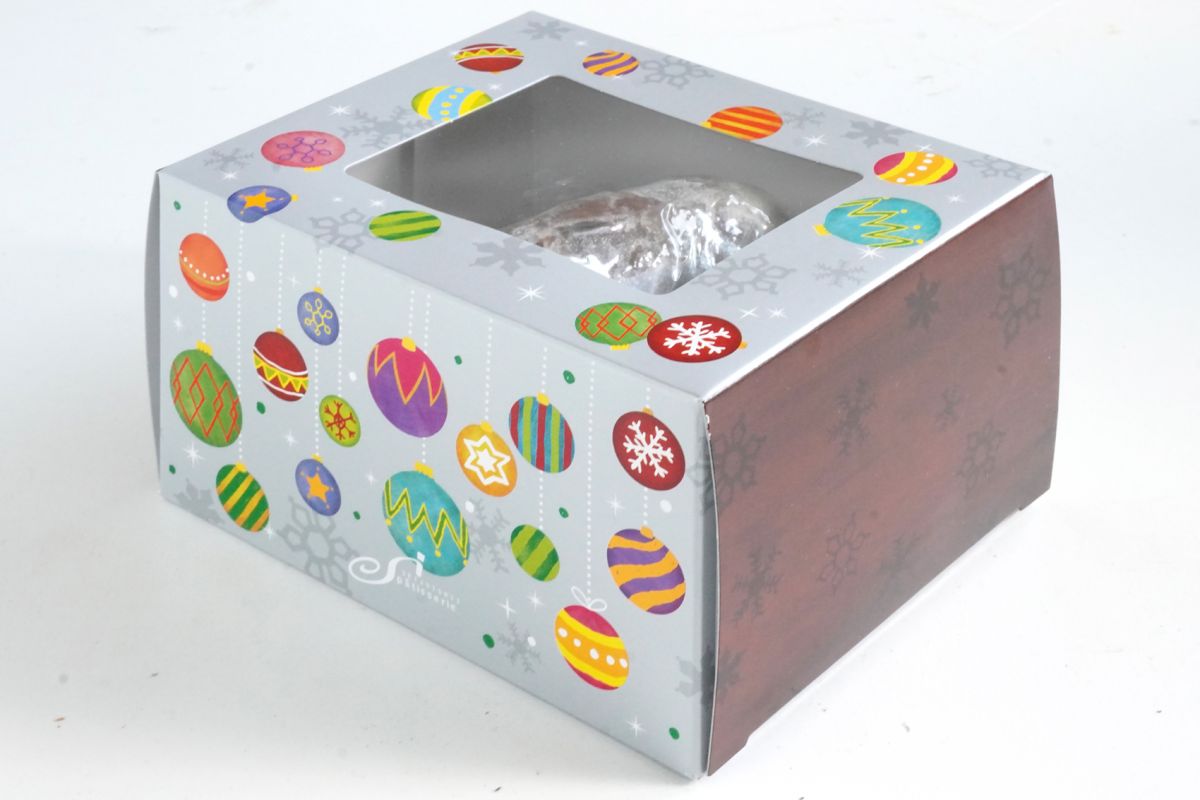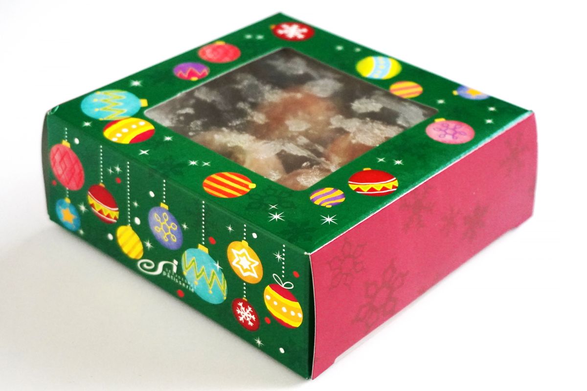 「成城石井自家製 5種ドライフルーツのプチシュトーレン」4個入り638円は、赤と緑のクリスマスカラーに、クリスマスのオーナメントが描かれたかわいい箱の中に入っています。