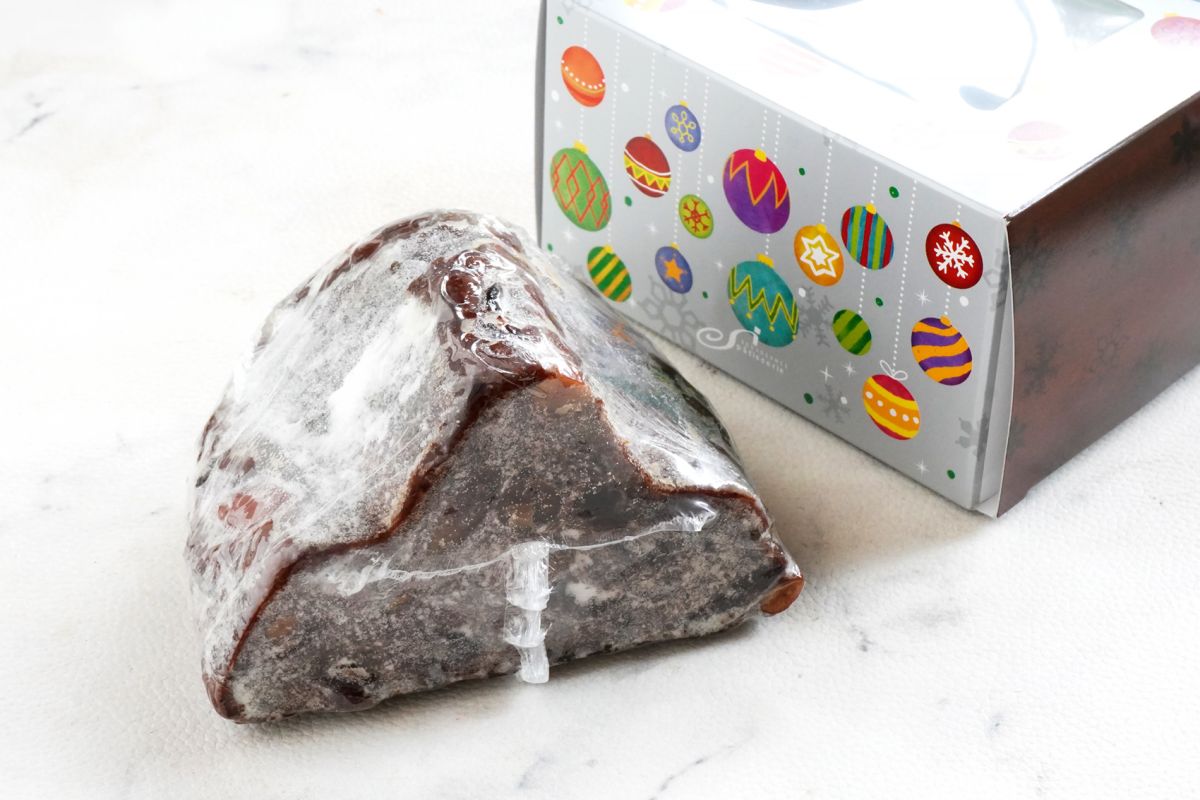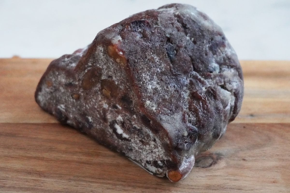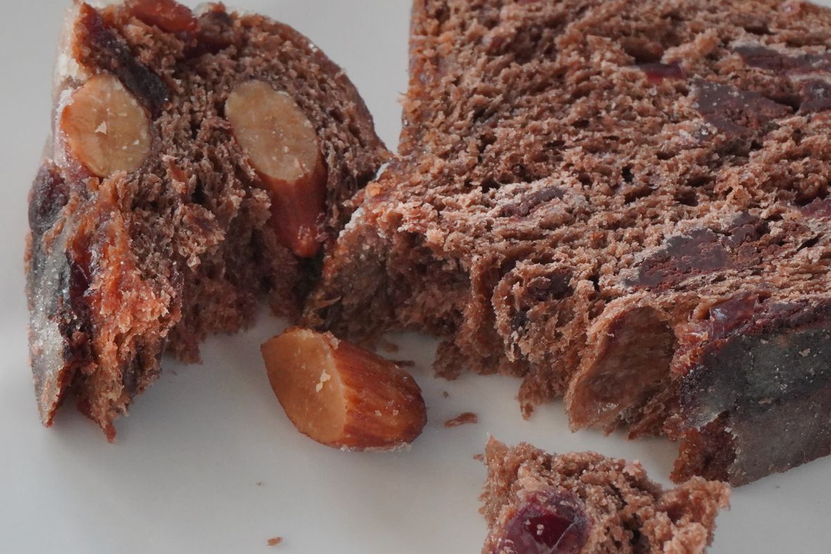 ゴロンとした無骨な形は、よくあるシュトーレンと同じですが、ダークチョコレートの色合いになっていて、断面にはナッツやドライフルーツが見えます。