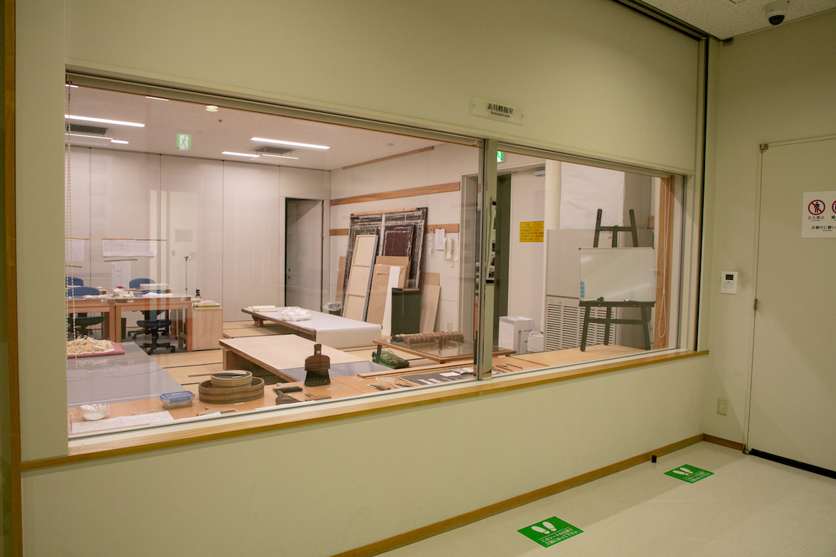 ガラス窓越しに修復作業を間近で見学できるのは嬉しい!取材時は修復作業をされていなかったのですが、修復作業をしていないときでも、ガラス窓越しに修復作業に使う道具などを眺められるので良いですね。