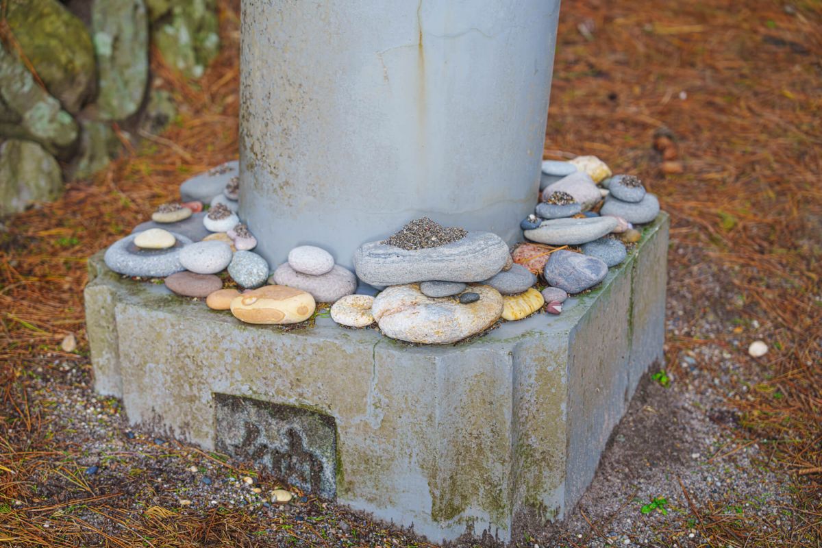 この地では海辺の砂や小石にも神が籠るとされ、これらを「潮花」とよび、神に捧げる習わしがあるのだそう。先ほど「長浜海岸」で拾った平たい石の上に濡れた砂をのせてから、鳥居の下にお供えをして参拝を行います。