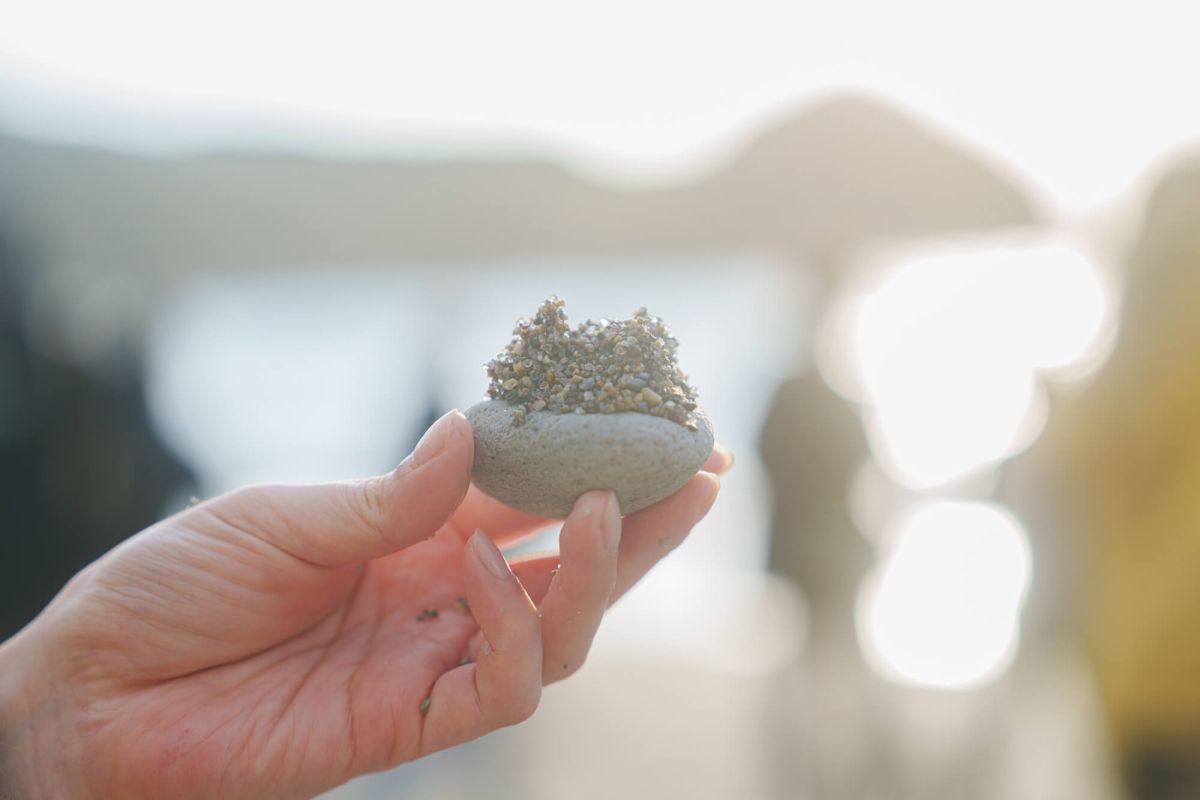 次なる目的地「阿波命神社」を訪れる前に、陽が傾いた「長浜海岸」で、彩り豊かで平たい石探しを。まるで子どものころにした宝探しの続きのような時間を過ごせて心が洗われたよう。