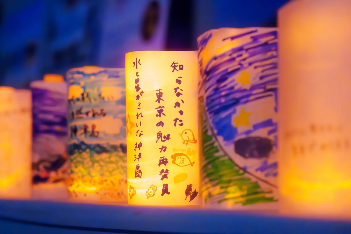 ツアーで星と水を大切にするための神津島での取組みを学んだあとは、島の魅力を振り返りながら、ペットボトルランタン作りのワークショップに参加しました。廃棄予定だったペットボトルを使い、自分が感じた島の魅力などをランタンにメッセージとして記していきます。