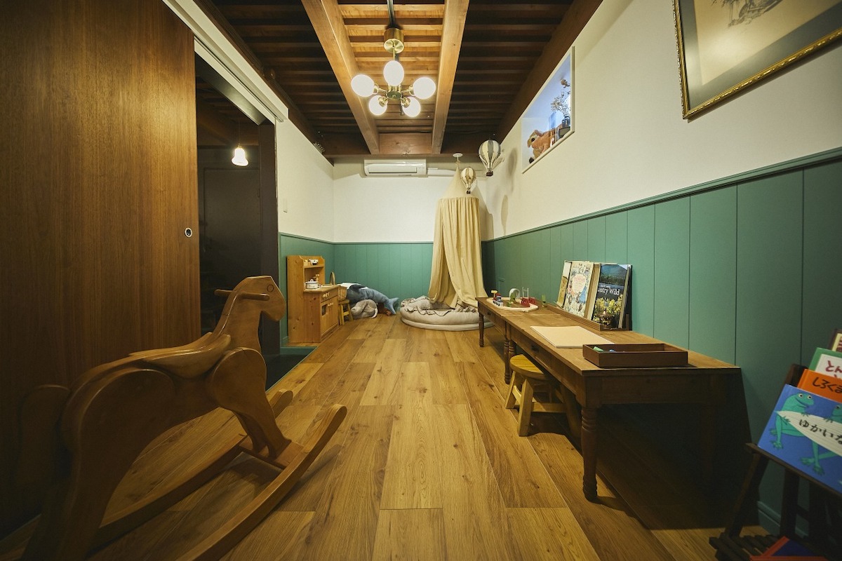 キッズルームは天蓋付きのクッションやセンスのよいおもちゃが置かれていて、小さなお子さんたちが自由に遊べる空間。ゆっくりとカフェを楽しめない子育て中のパパ・ママのために考えられたスペースです。