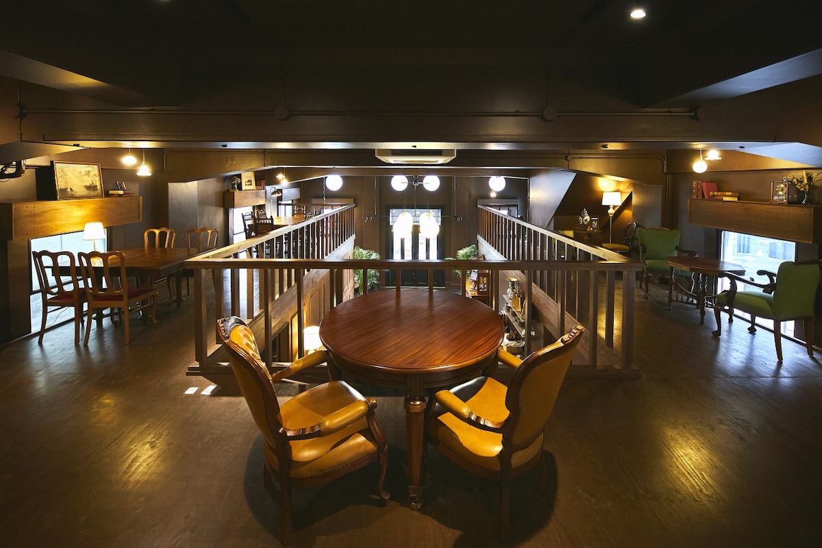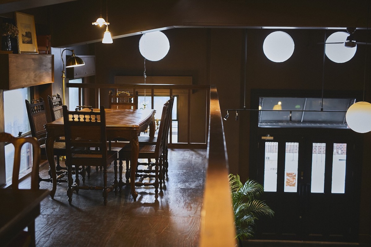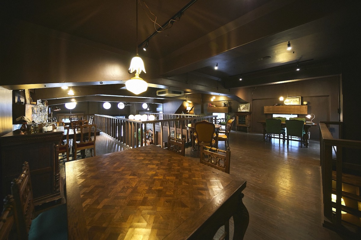 二階奥から全体を見渡せば、この空間のぜいたくさがよりわかります。重厚感のあるテーブルや椅子は、オランダを中心としたアンティーク家具。それぞれに意匠の違うものがゆとりをもって配されています。