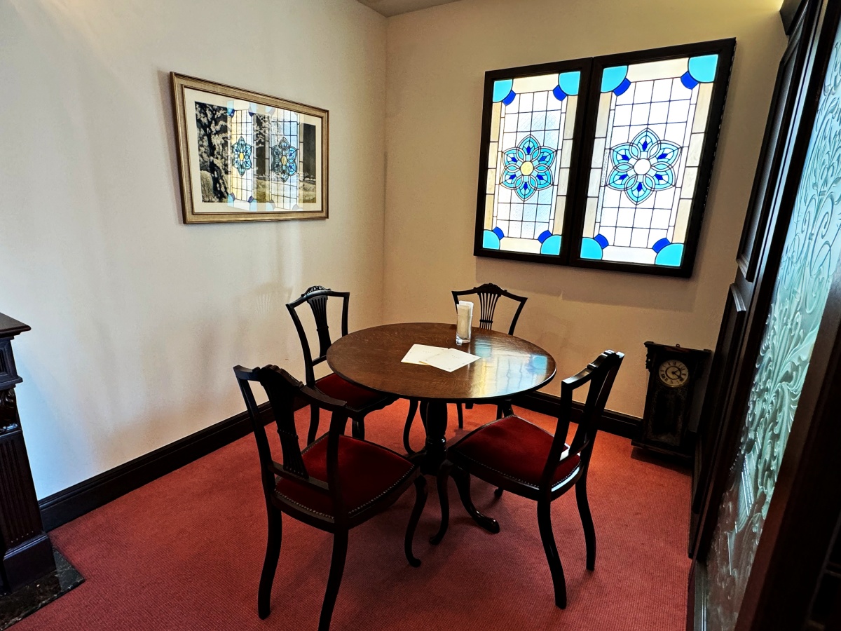 ブルーのステンドグラスが美しいこちらのスペースは、パーテーションで区切れば、半個室としても利用することも可能。