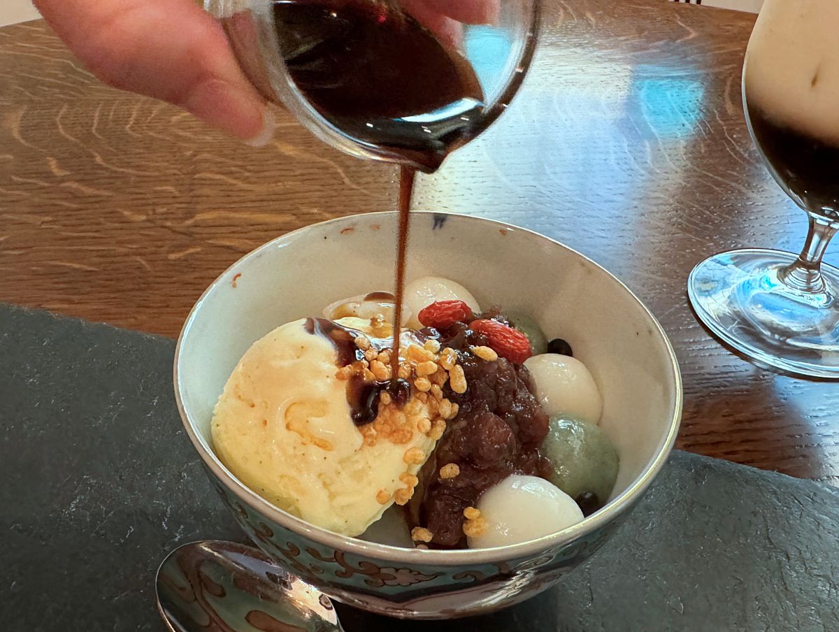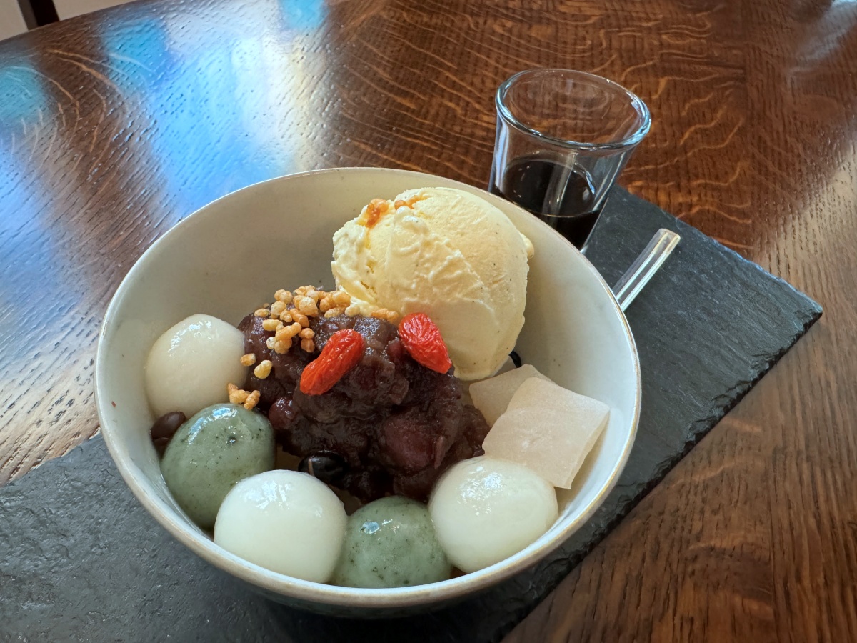 こっくりと濃厚な黒蜜が、豆本来のおいしさを生かした上品な甘さの粒餡やもっちりとした白玉、梅酢でわずかに酸味を加えた求肥、ぷるんとした寒天に絡んで、たまらないおいしさ。