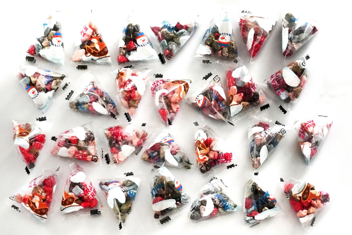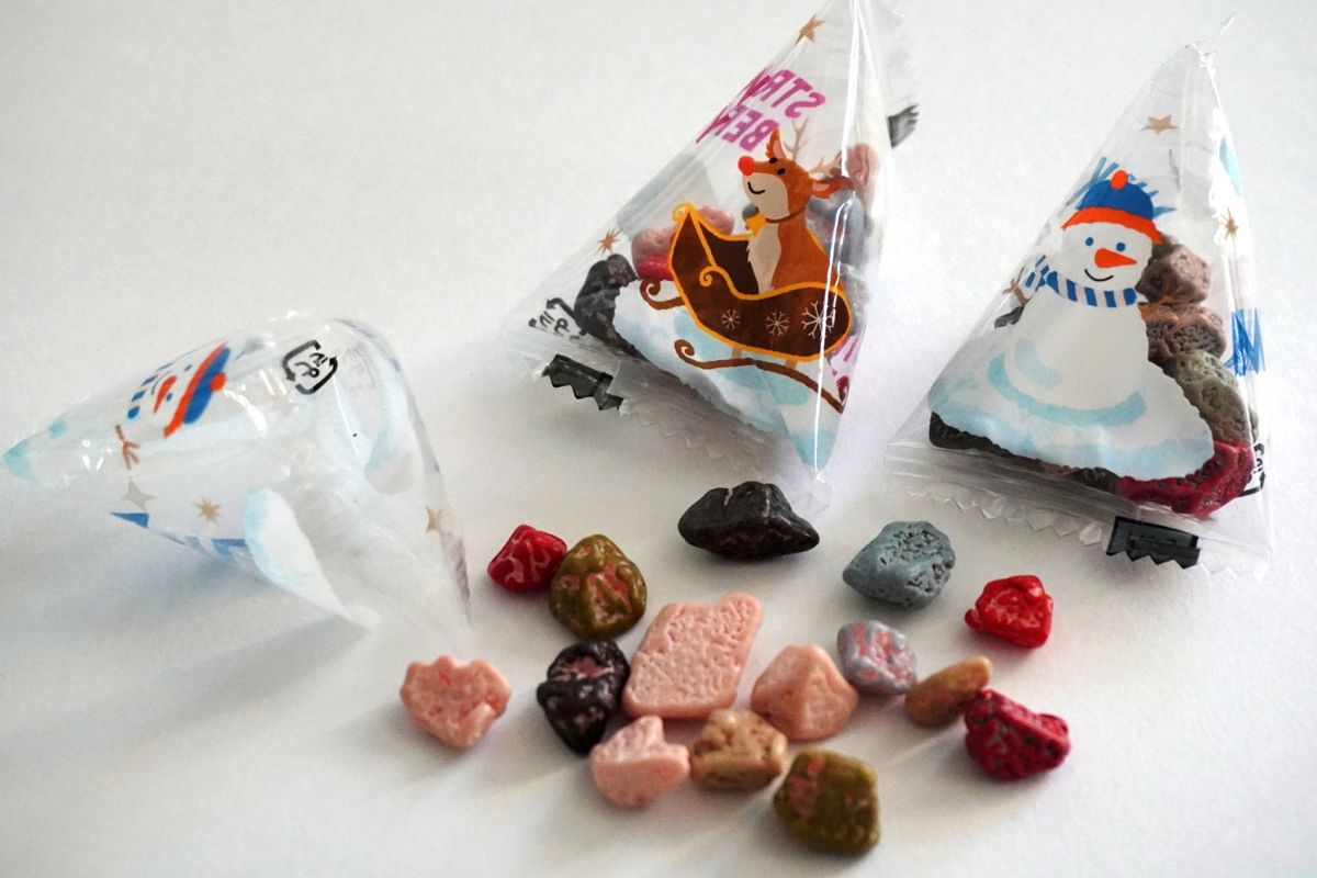 テトラ型のパックは、雪だるまとトナカイ柄の2種類。中に入っているのは小石そっくりのチョコレートで、色、大きさ、形もさまざまです。