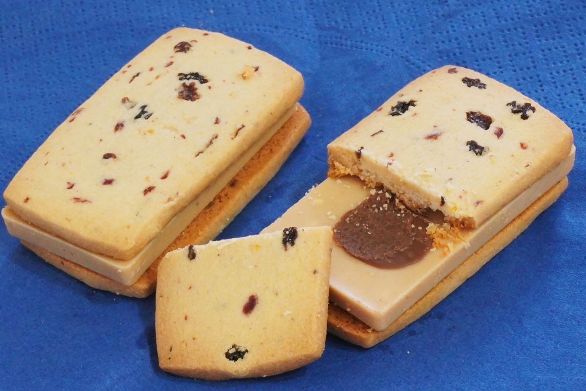 1個の大きさは縦3.5cm、横6.5cm、高さ2cmほど。ドライフルーツやスパイスが練り込まれたクッキー生地に、厚さ6mmほどのアーモンドの風味豊かなチョコレートがサンドされています。