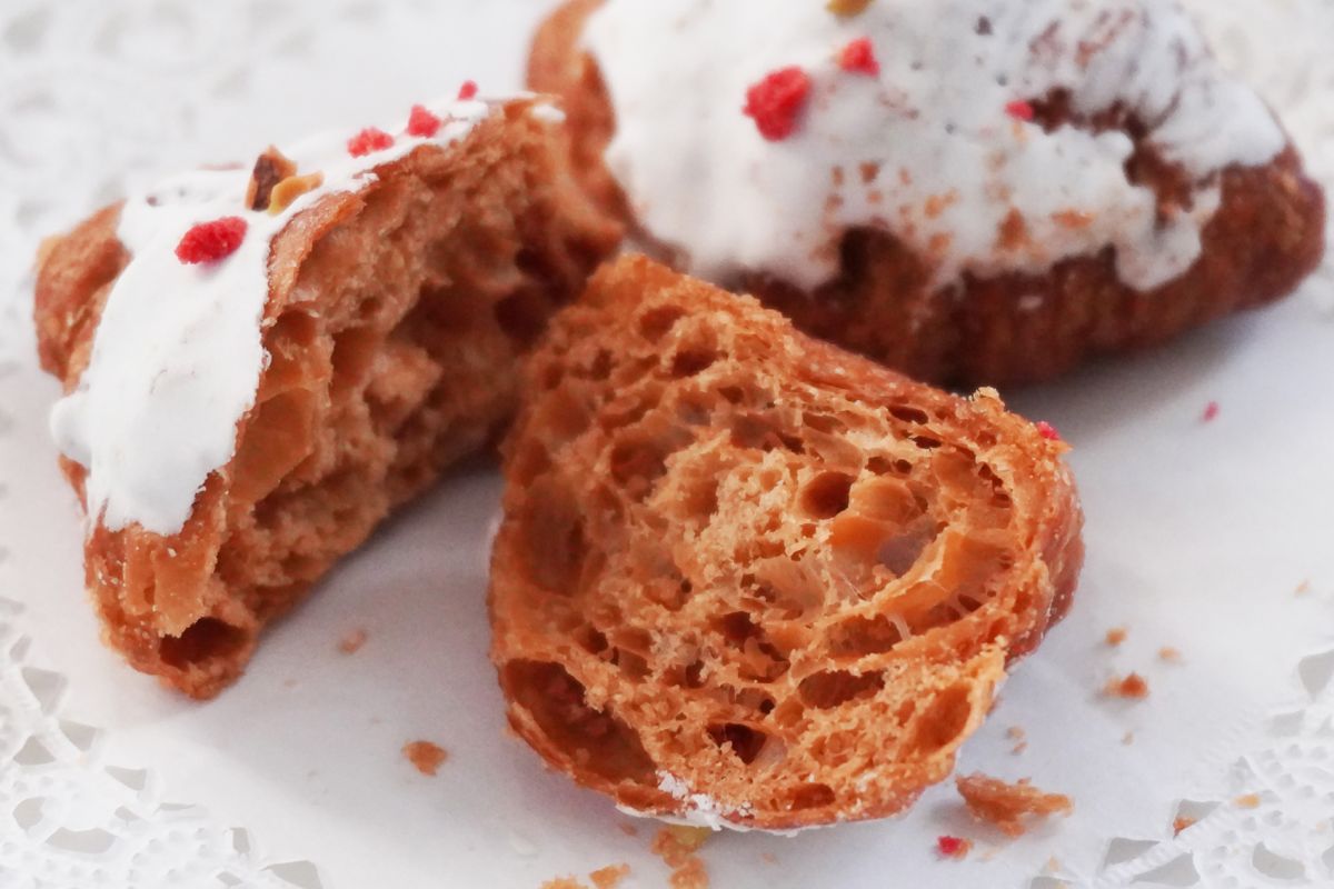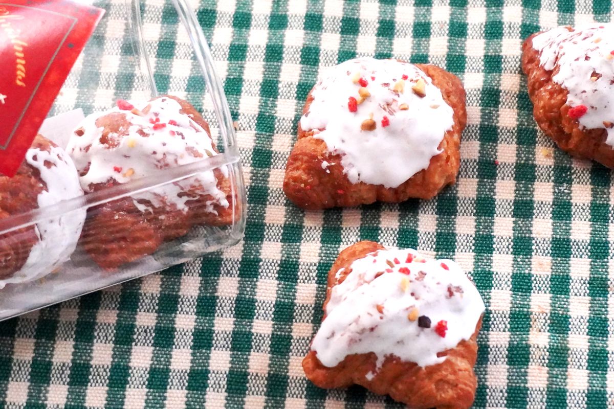 クロワッサンの上には、雪をイメージさせる真っ白なアイシングがかかり、ピスタチオや乾燥イチゴのチップがトッピングされています。