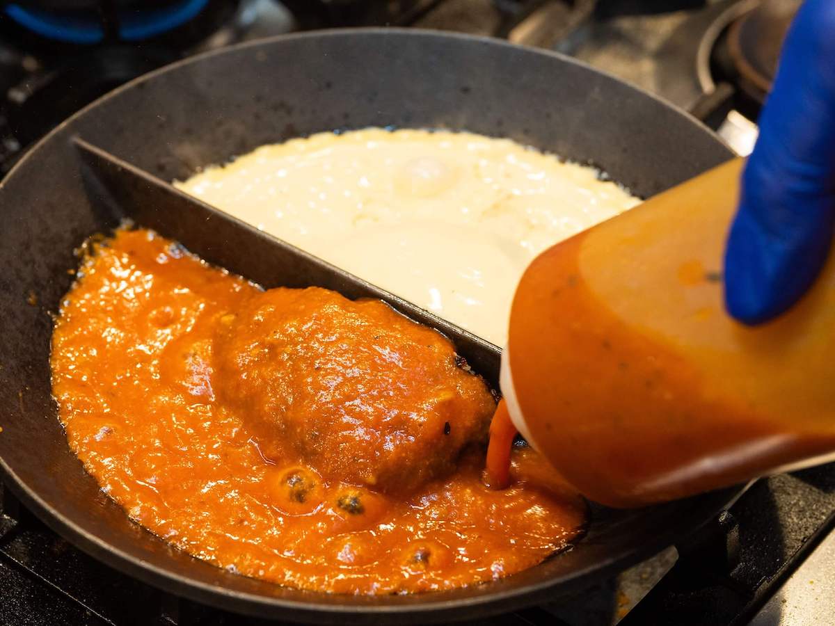 今注いでいるのは、ガーリックトマトソース。注いだソースでハンバーグがバランスよく隠れるようにと、鍋の深さや仕切りの高さなども考えられているんですよ。おいしく味わうポイントは、ソースにお肉のうま味を混ぜて食べること♪