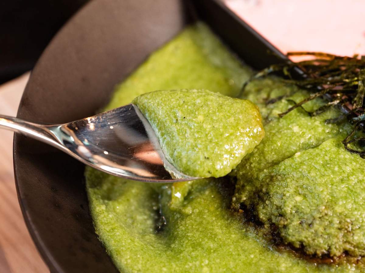 「とろろわさび」は、ワサビがふわりと香る上品な和風だしのソース。あっさりとしているので、ハンバーグの量をいつもより多めにしても最後のひと口まで飽きることなくいただけます。この濃い緑色はワサビの色ではなく、ホウレンソウからとったものなんですよ。
