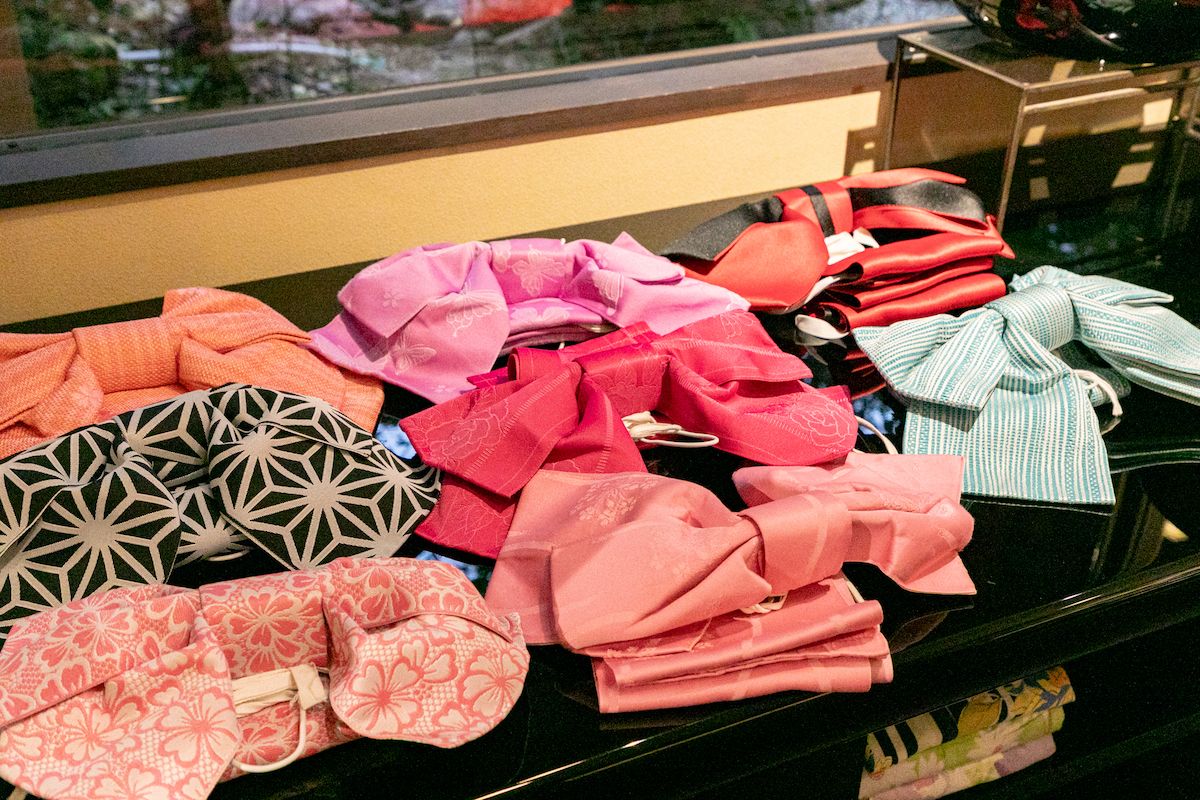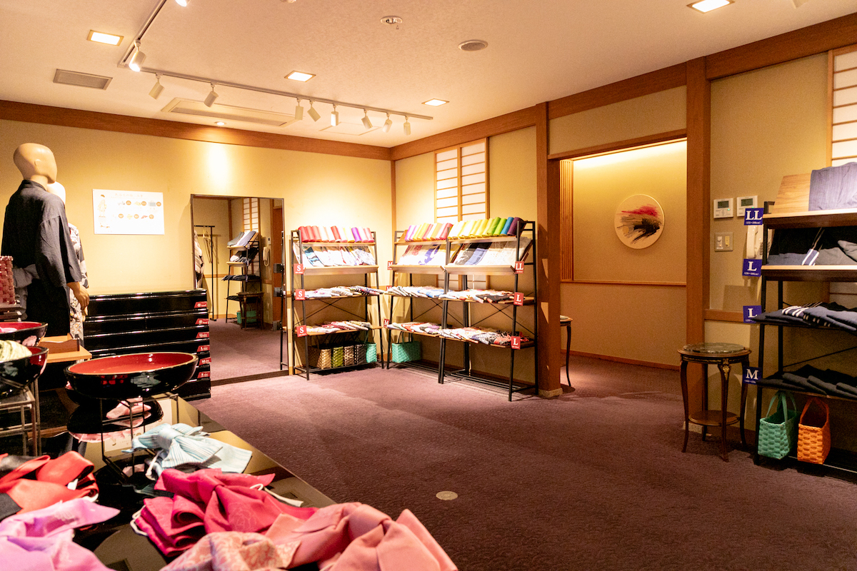 エントランスに入ってチェックインしたら、まず行ってほしいのが1階にある「色浴衣コーナー」。浴衣を借りられる旅館は数多くありますが、写真を見てください! 広いスペースに豊富な華浴衣、帯、湯かご、羽織、ストール、男性用の浴衣が用意されており、好きなものを自由に選べるんです。