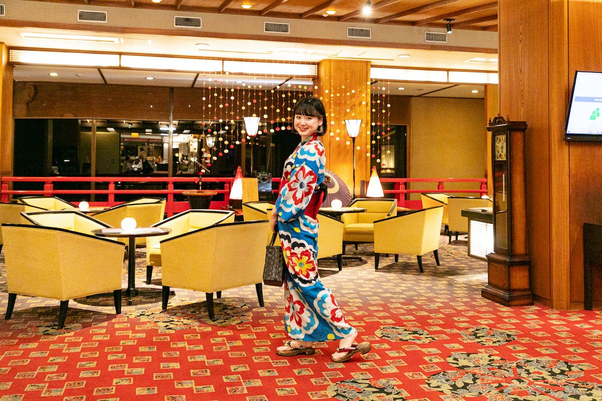 着物を選んだら客室に行って着替えます。客室に下駄もあるので、何も準備しなくても完璧な温泉街コーデになりました♪「温泉街を浴衣で散策したいなぁ…」、「かわいい浴衣を友達と着たいなぁ…」と思っている方にぜひおすすめです。